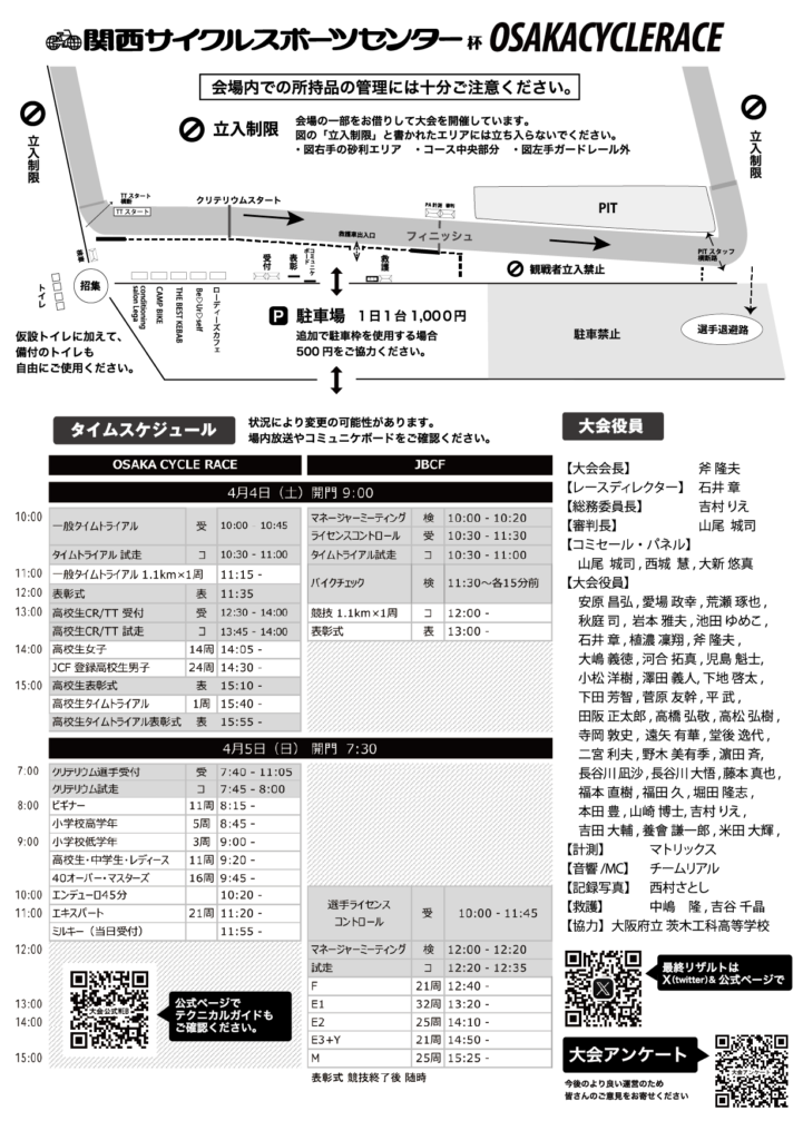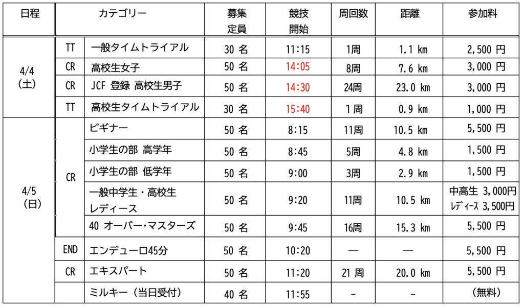 4/4土曜日の午後のクリテリウムに時間の変更があります。参加者の選手のみなさんはご確認ください。